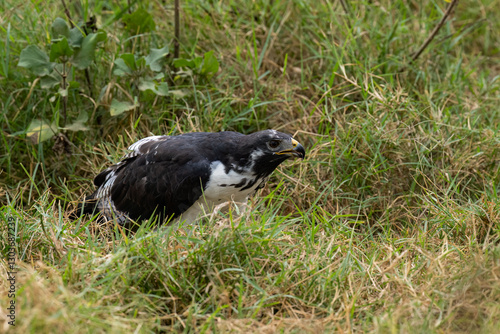Fototapeta premium African Hawk-Eagle sitting low in the grass looking for prey