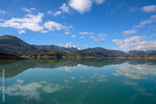 © boulham, Obraz premium African lake, sunset in an African lake full of green grass and blue water with clouds, African landscape and lake and river water in Jijel, Algeria, nature and environment of Africa, Bodies of Water.