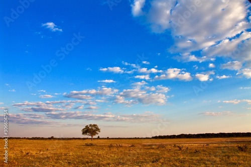 © Soldo76, Obraz premium African landscape with isolated acacia tree and blue sky on the background