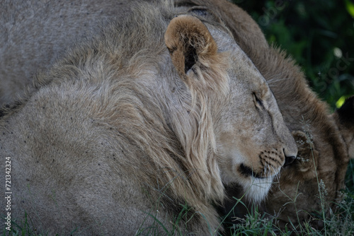 © константин константи, Naklejka premium African lion close-up on rest in natural conditions in Kenya national park