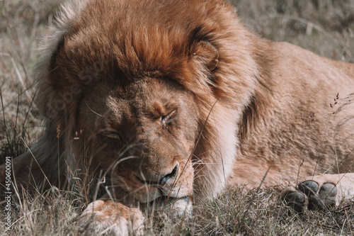© Brayden, Naklejka premium African lion sitting in and empty field.