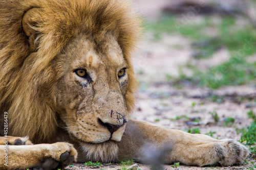 Naklejka premium African male lion sitting on the ground at the edge of a water hole in South...