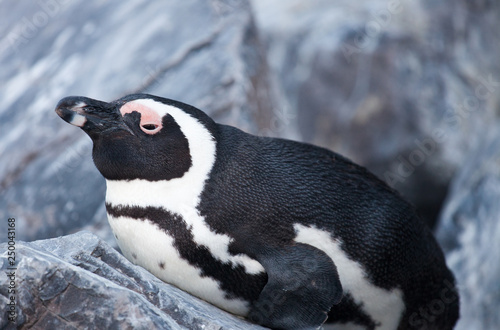 Naklejka premium African penguin ,Spheniscus demersus, on Boulders Beach near Cape Town South Africa. sleeping on the stone
