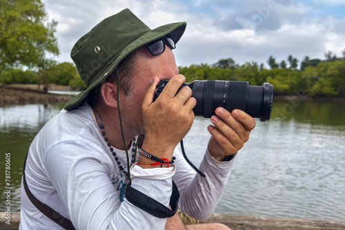 © diy13, Obraz premium African safari on the water. Wildlife photographer with camera photographing nature on lake at sunset. Man is taking picture outdoors