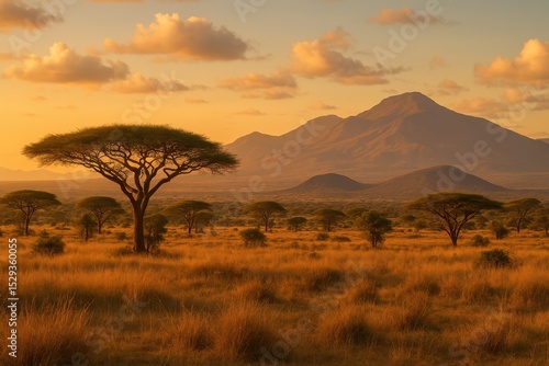 © Bijac, Obraz premium African Savanna Landscape with Majestic Mountain Views in National Wildlife Park During Golden Hour