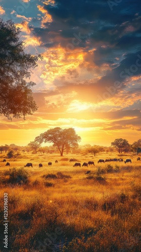 © arlisa, Obraz premium African savanna sunset herd grazing landscape