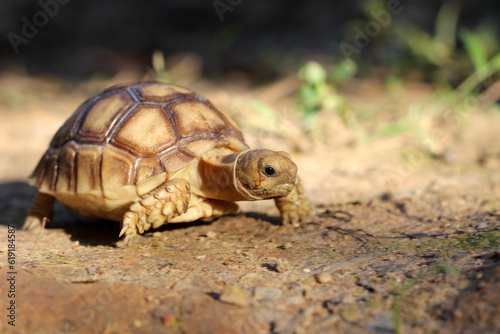 © Aekkaphum, Obraz premium African Sulcata Tortoise Natural Habitat,Close up African spurred tortoise resting in the garden, Slow life ,Africa spurred tortoise sunbathe on ground with his protective shell ,Beautiful Tortoise