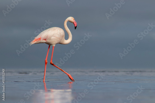 © Yuliia Lakeienko, Obraz premium African wild birds. Lone great flamingo on the blue lagoon in the morning