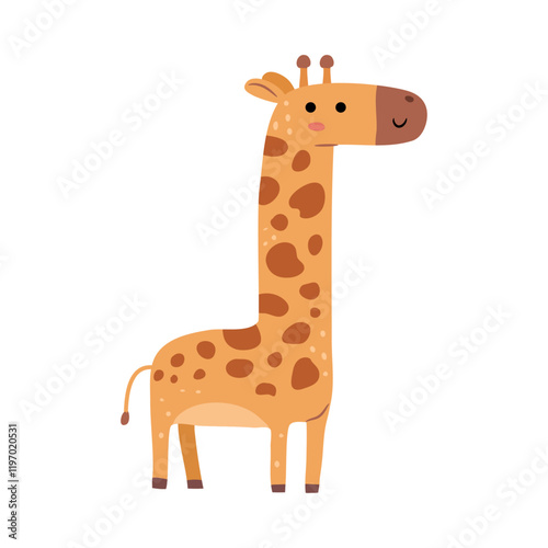 Naklejka premium African wildlife animal with long neck and spotted coat fur. Vector cute giraffe standing and smiling. Isolated cartoon character from reserve or zoo park. Toy for children, biodiversity of Africa