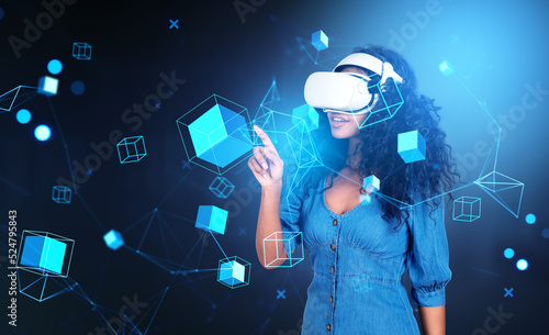 Fototapeta premium African woman in vr glasses, blocks in cyberspace, metaverse and