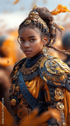 Fototapeta premium African women donning intricately designed knight suits, ready for battle in an ancient battlefield.