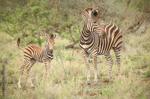 © Sunshine Seeds, Fototapeta premium African Zebra Mother and Calf in a South African game reserve