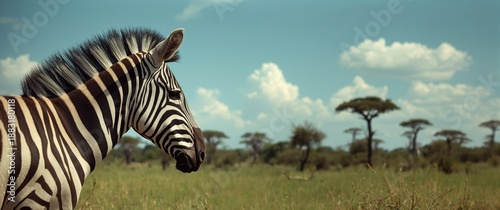Fototapeta premium African zebra profile featuring white, black stripes, and mammal wildlife
