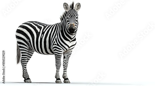 © Yuliia, Fototapeta premium African zebra with distinctive black and white striped pattern standing on white background, isolated for wildlife and nature designs.
