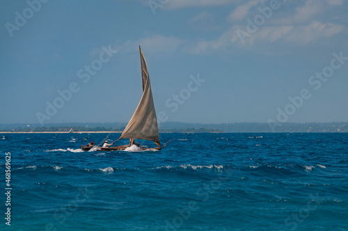 © Денис Ржанов, Naklejka premium Afrikan fishing sailboat Ngalawa goes on the deep blue waves near Mnemba island, Tanzania