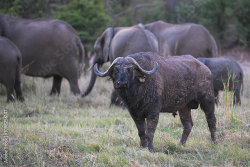 Fototapeta premium Afrikanischer Büffel vor Elefanten