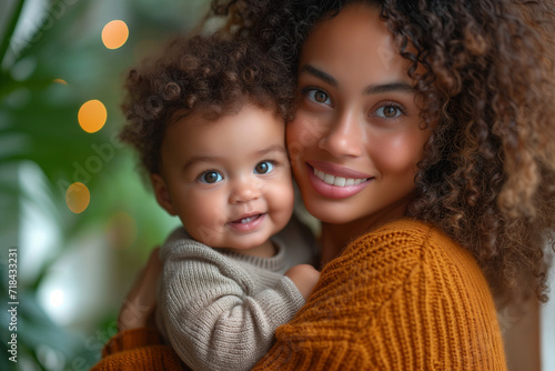 Obraz premium Afro-American Mother and Her Baby in Arms, Joy of a Woman and Her Newborn Son, Loving Hug Inside a Home Full of Love, Mother's Day, Women's Day