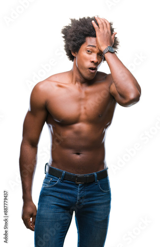 Fototapeta premium Afro american shirtless man showing nude body over isolated background surprised with hand on head for mistake, remember error. Forgot, bad memory concept.
