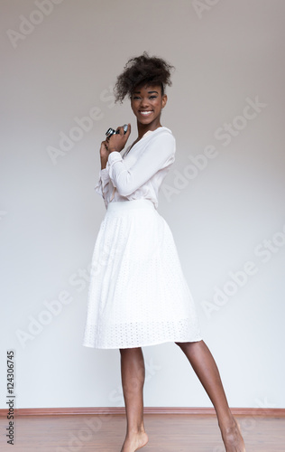 © Myvisuals, Naklejka premium Afro american woman holding vintage camera and taking photograph