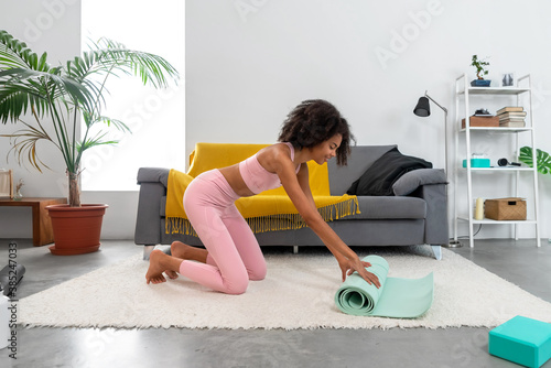 © Bisual Photo, Fototapeta premium Afro woman unrolling her yoga mat at home