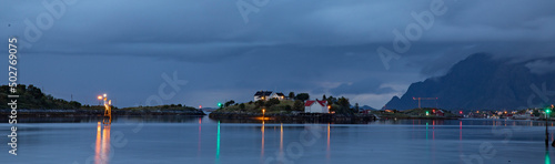 Fototapeta premium After sunset in Bronnoysund harbor - Buholmen island, Northern Norway,scandinavia,Europe