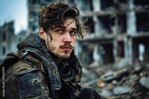 © Yuliia, Fototapeta premium Aftermath: Desolate Cityscape in Ruins - young caucasian man with beard
