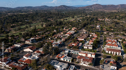 © Matt Gush, Fototapeta premium Afternoon aerial view of tree framed mission revival style architecture of historic downtown Rancho Santa Fe, California, USA.