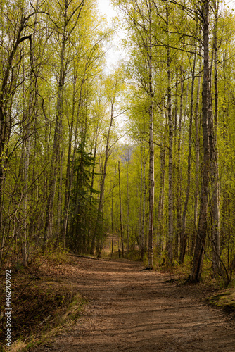 © LB Photo Co, Fototapeta premium Afternoon sunlight shines on birch trees in the Eklutna River Valley, Alaska.