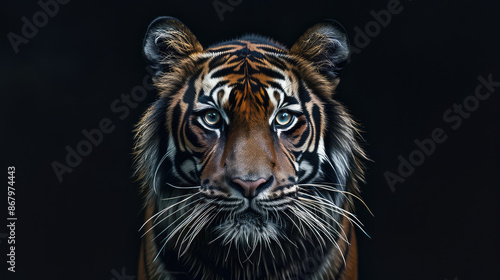 Fototapeta premium Against a dramatic black backdrop, the powerful and fierce head of a Sumatran tiger commands attention.