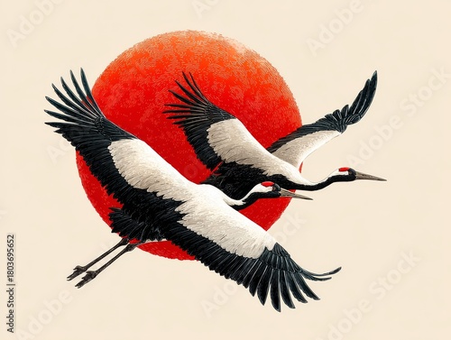 © MKS, Obraz premium Against a vibrant red sun, two elegant red crowned cranes fly with grace in a Japanese inspired artwork