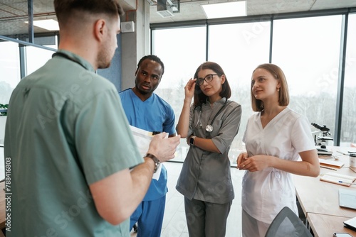 © standret, Obraz premium Against big panoramic windows. Group of doctors are together indoors