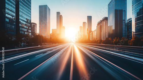 Fototapeta premium Against the backdrop of a sunny sunset, a modern city with skyscrapers roads...
