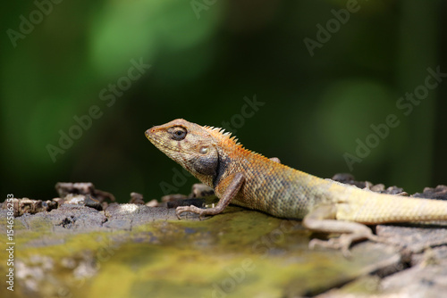 © Oleg, Fototapeta premium Agama Lizard sitting on a tree stump. Calotes in tropical forest