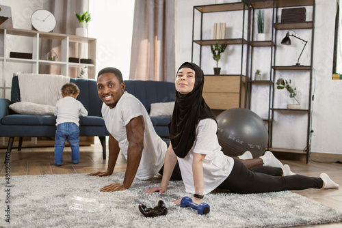 © sofiko14, Obraz premium 25-30 age beautiful sporty couple practicing yoga doing four-limbed staff pose at home. Muscular Athletic African Man and Beautiful Muslim Fitness Woman in Workout Clothes Doing Push Up Exercises.