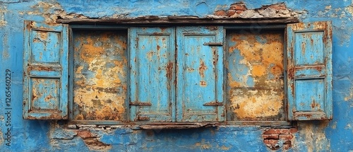 © Supriyati Pixxel, Naklejka premium Aged blue shutters on crumbling wall