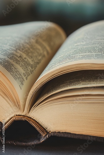 © jambulart, Fototapeta premium Aged book pages, open, revealing text.