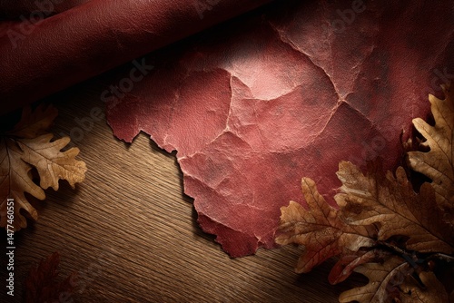 Obraz premium Aged crimson parchment and autumn leaves on wood.