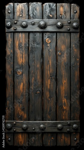 © Semi, Fototapeta premium Aged Dark Wooden Panel With Metal Bands