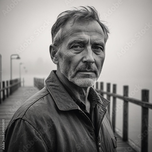Fototapeta premium Aged Gent on Misty Pier Timeless Noir