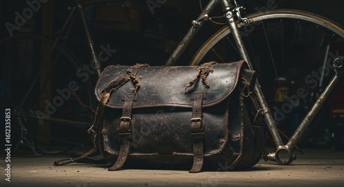 © lukk, Fototapeta premium Aged leather satchel near bikes