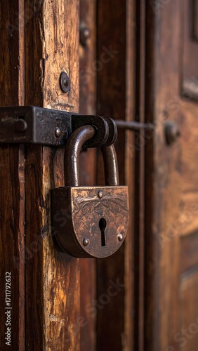 © Gandi, Fototapeta premium Aged padlock on weathered wooden door