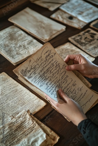 © jambulart, Obraz premium Aged papers, cursive script, hands, careful examination.