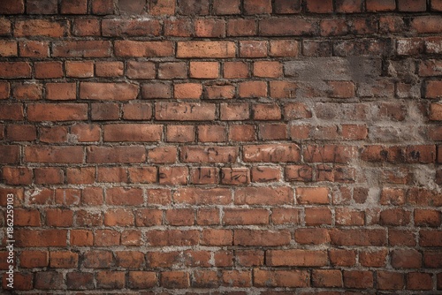 Obraz premium Aged red brick wall with patchy mortar and graffiti marks