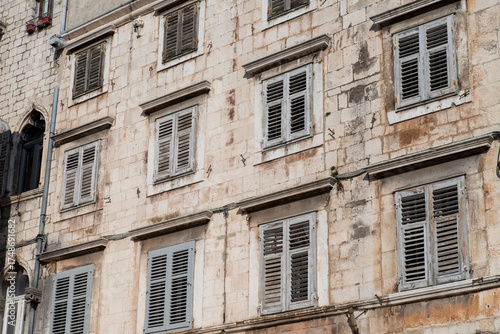Fototapeta premium Aged stone building with gray wooden window shutters