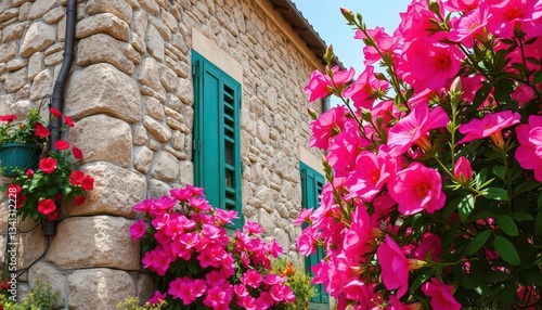 Naklejka premium Aged weathered stone building juxtaposed with vibrant blooming flowers,...