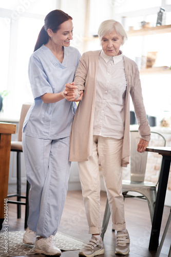 Fototapeta premium Aged woman making first steps after surgery on legs