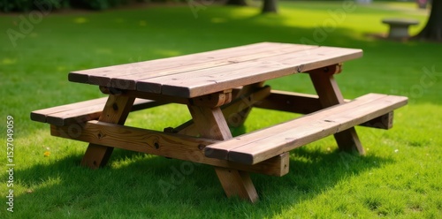 © Suradech, Fototapeta premium Aged wood picnic table, classic checkered tablecloth, texture, background, farm