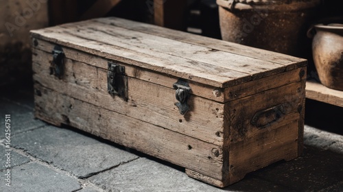 © kucret, Obraz premium Aged wooden chest on stone floor