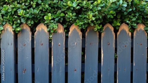 © tri, Fototapeta premium Aged wooden fence with a lush hedge