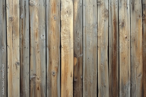 Fototapeta premium Aged wooden planks forming a vertical fence. Close-up view of weathered wood, showing variations in color and grain
